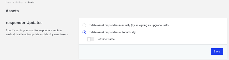 Section titled “Automatic Responder update”Once a Console update is installed, its associated Responders will automatically receive and execute an update task during their next connection to the updated console. It’s important to note that this automatic update behavior is only active if the ‘Update asset Responders automatically’ setting is enabled, as illustrated in the screenshot below.