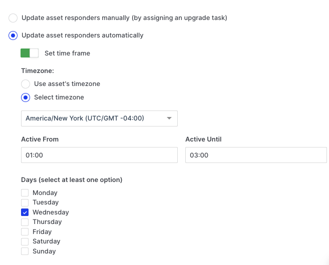 Section titled “Manual Responder update”If the setting selected is, ‘Update asset Responders manually (by assigning an upgrade task)’ the update task can be generated from the individual Asset page: