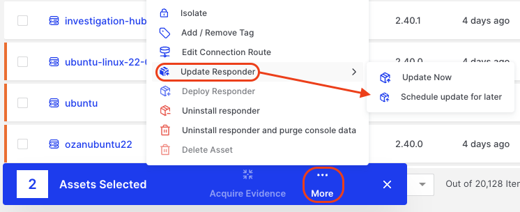 - Alternatively, assets can be scheduled for responder updates either through the individual Asset action button or by using the bulk actions bar.