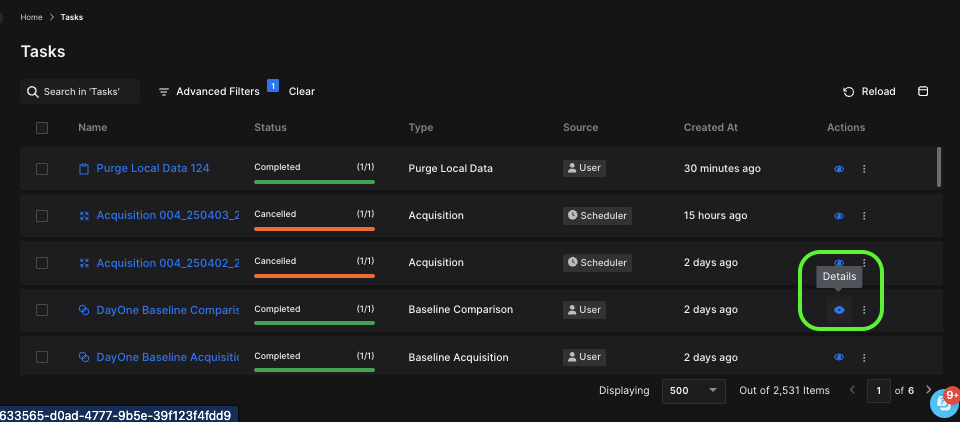 The blue ‘eye’ icon at the end of each task entry allows users to view detailed information about the task.