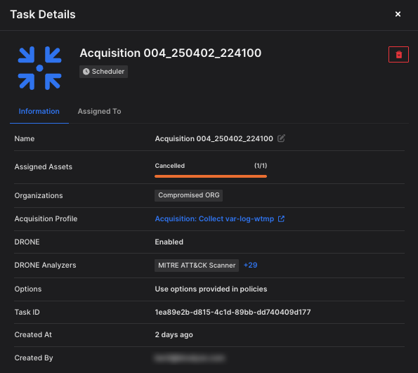 In the Task Details window, there are two tabs: Information and Assigned To. The Information tab displays details such as the creator of the task, the policy applied, the DRONE analyzers used, and the selected acquisition profile.