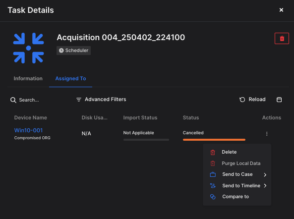 The Assigned To tab provides information about the assets to which the task has been assigned. For each asset, an Actions menu is available, enabling investigators to: