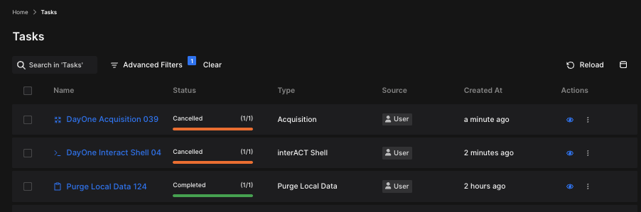 For each task, detailed information such as task type (e.g., acquisition, triage, timeline generation), status, and associated endpoints is available, allowing for granular tracking and auditability.