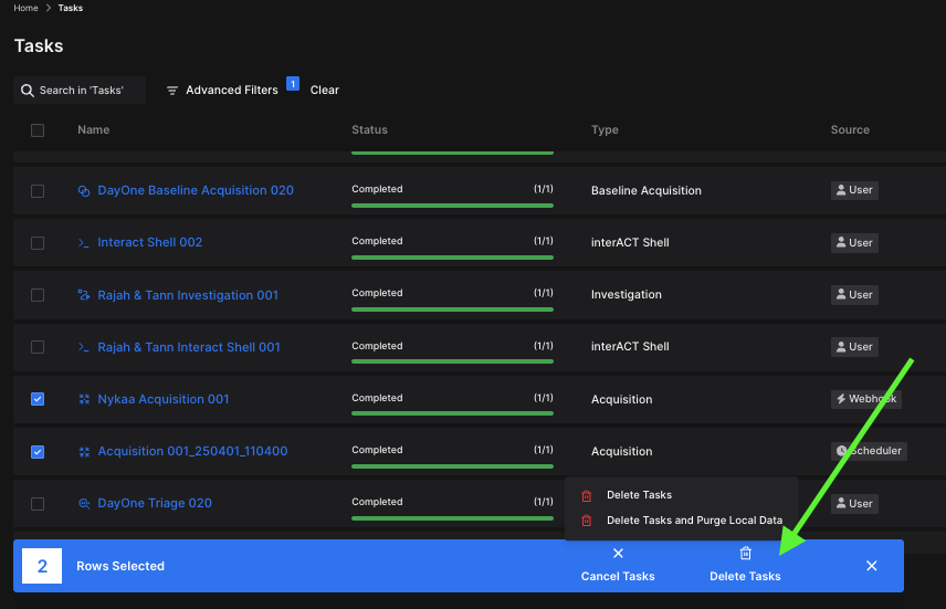 In addition to cancellation, users can now delete multiple tasks in one action. When selecting the Delete Tasks option from the bulk action bar, two deletion modes are available:
