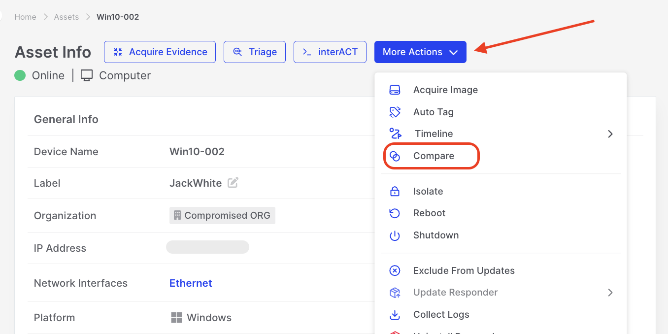 The Compare feature enables proactive forensics through baseline analysis, allowing investigators to focus on forensic evidence from the earliest stages of an investigation. Using a patent-pending approach, it identifies and highlights forensic artifacts—added, modified, or deleted—between asset snapshots.
