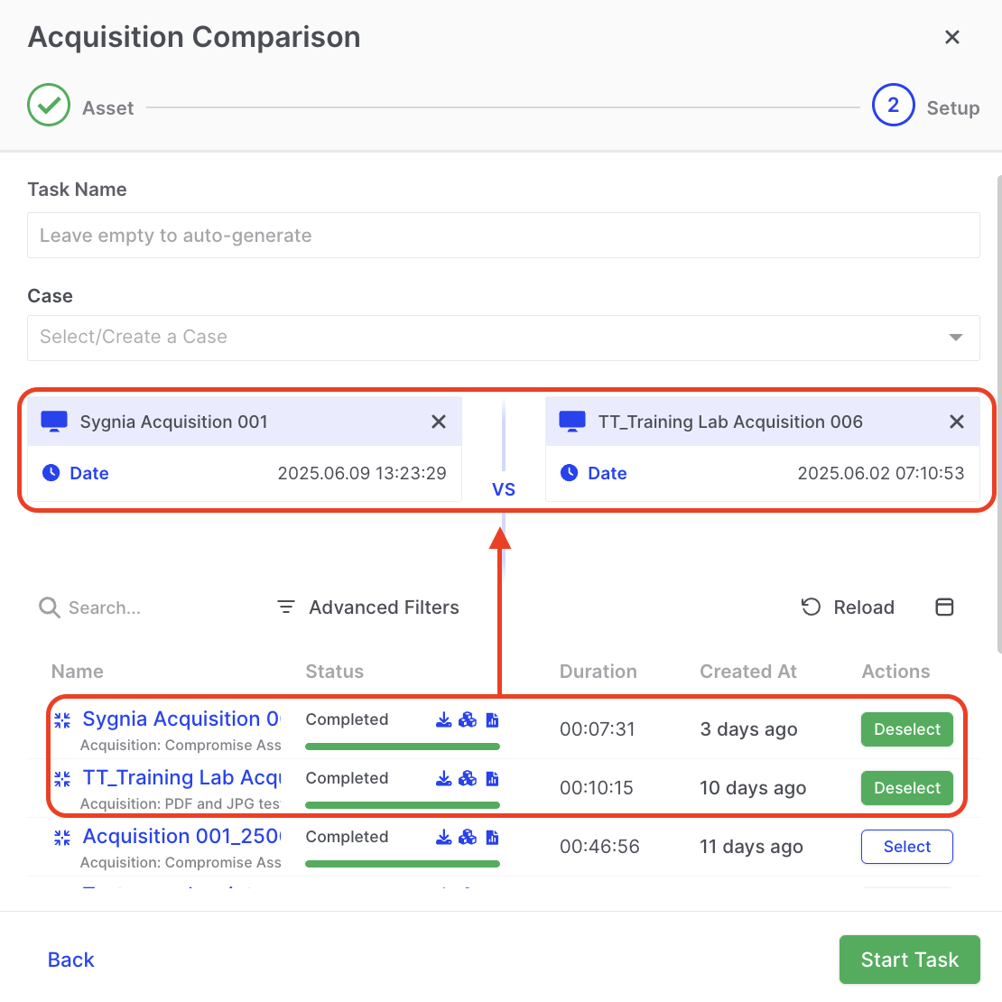 3. Specify the Acquisitions to Compare