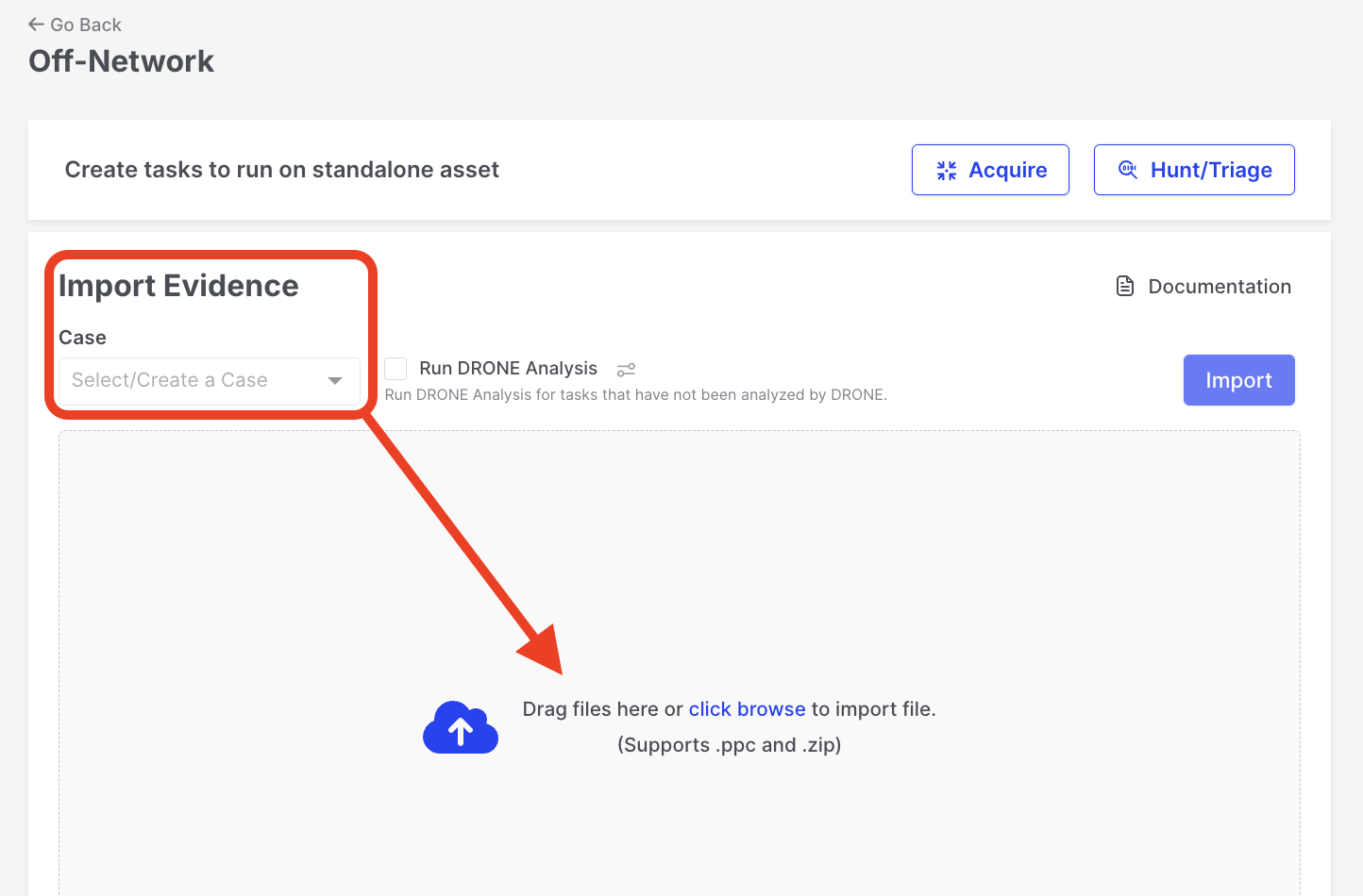 3. Import the .zip or .ppc file into the XDR Forensics console that created the binary. You can tick Run DRONE Analysis during import to analyze the collection on the console—useful when the original acquisition was done without DRONE.