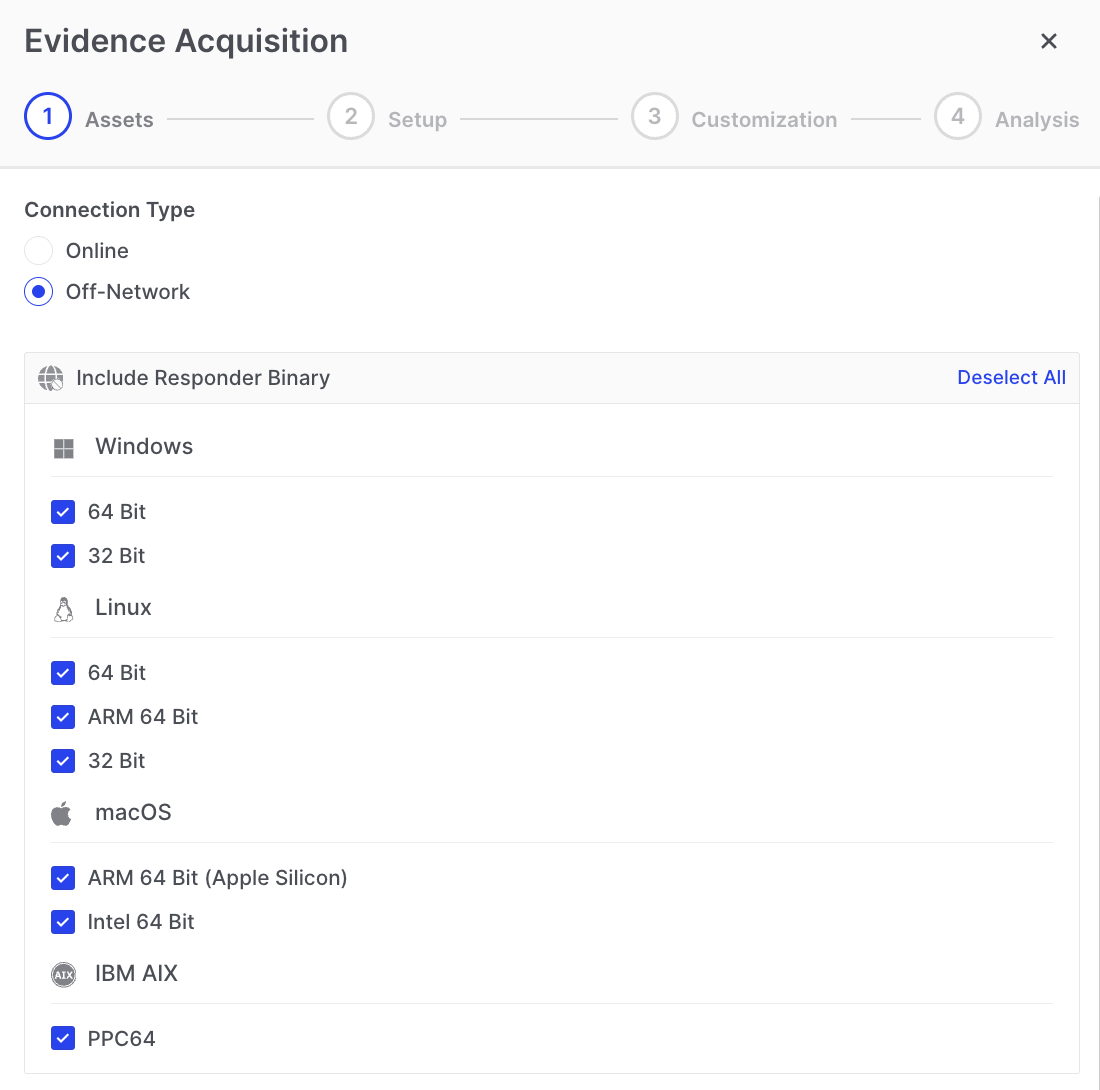 When creating an Off-Network binary, first choose the operating system on which you plan to execute the binary. If you anticipate needing to use the binary on multiple operating systems or are unsure which system will be used, consider generating a package with multiple binaries. This approach ensures that you will have a binary compatible with all the XDR Forensics-supported operating systems.