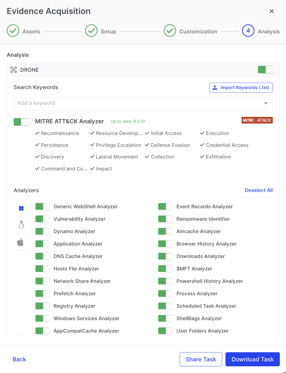 By default, the DRONE feature is enabled for off-network tasks. However, in the subsequent step, you have the option to deactivate the MITRE ATT&CK analyzer, as well as any or all of the post-acquisition analyzers, depending on your specific requirements.