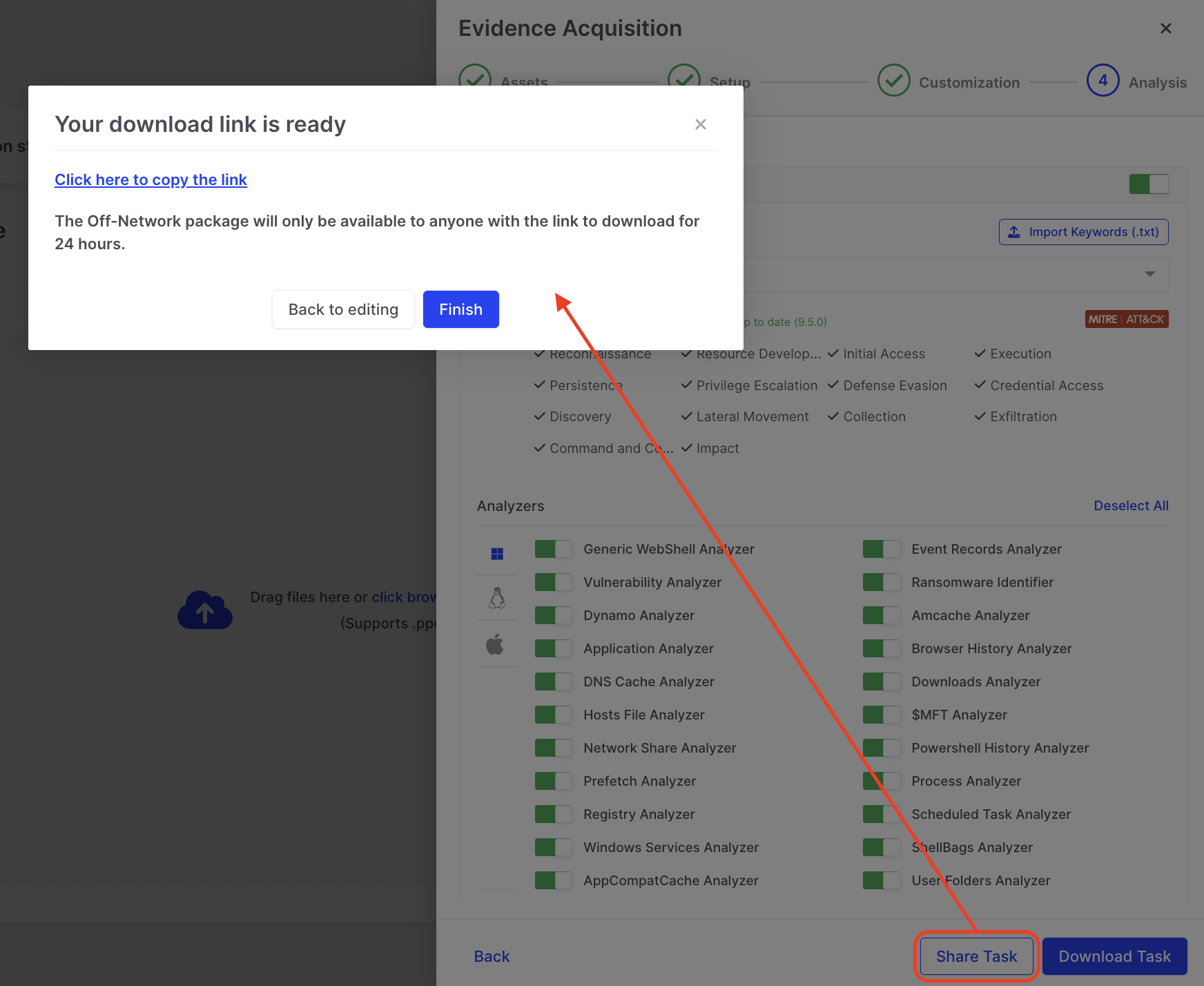 You can transfer this package to the off-network asset using a shareable link, email, file-sharing services, or by physically taking it to the asset. Once executed on the asset, the collected data is returned to the XDR Forensics console that generated the package for comprehensive analysis and reporting via the Investigation Hub.