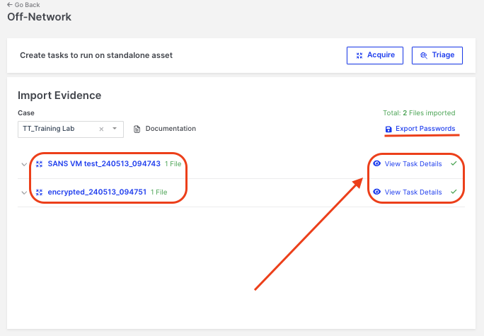 In the example provided above, Task 001 is ready for import and will be automatically ingested by the console. However, for Task 002, the user must manually enter a password. This password is the one selected during the generation of the Responder binary as additional security to that automatically provided by XDR Forensics.