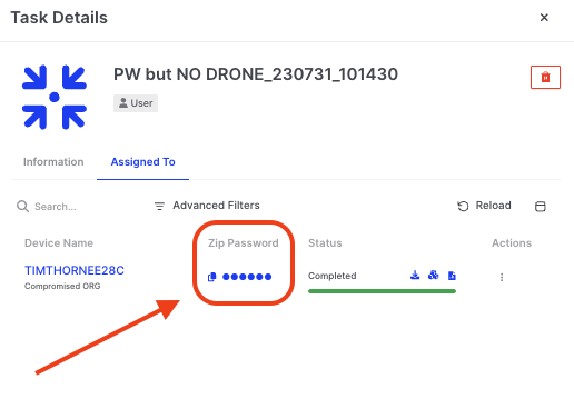 Clicking the “View Task Details” icon will open the Task Details window. Here, users can copy the zip password needed to decrypt the container locally.