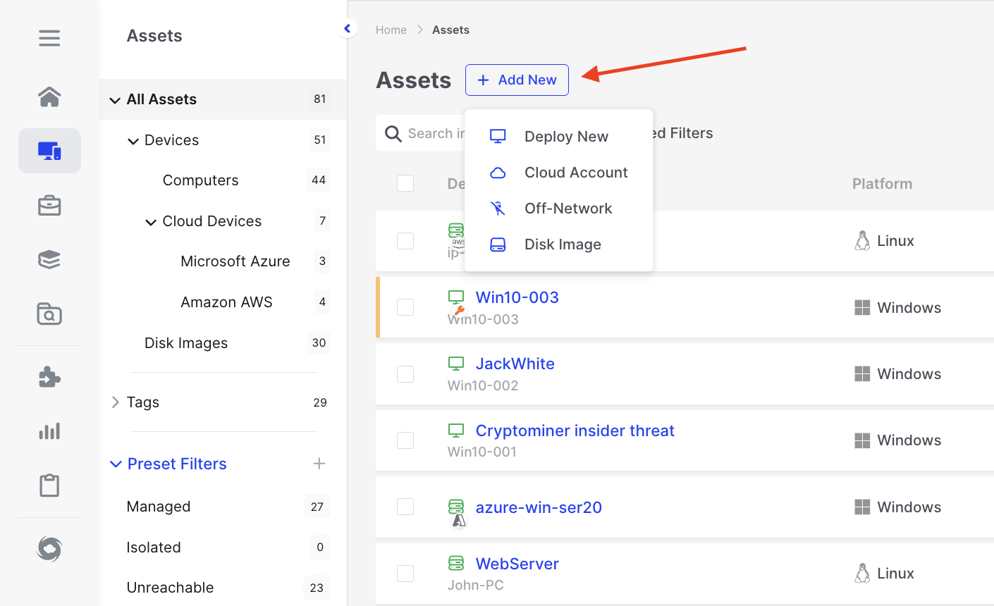 1. Deploy New - For assets that are attached to a network that is visible to the XDR Forensics console