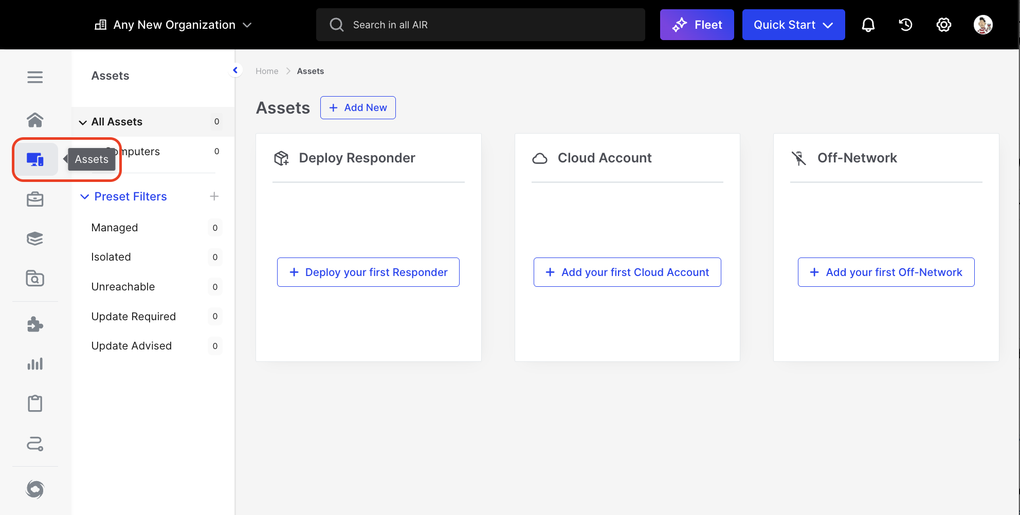 Installation of the XDR Forensics Responder on your assets is managed via the Assets button in the Main Menu: