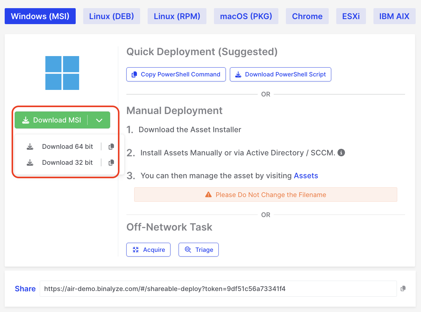 • All three operating systems support the Shareable deployment link available in the console. This method is often the most straightforward—simply share the link with your client, allowing them to download and install the Responder. An example link is shown below: