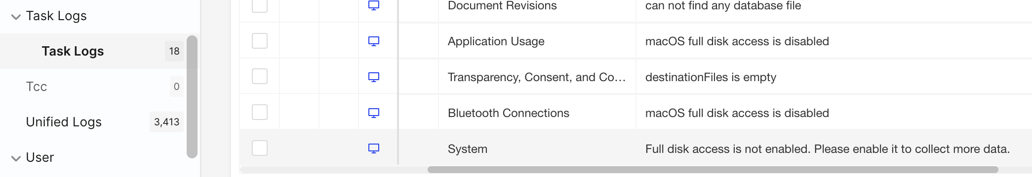 If Full Disk Access permission is not granted when starting any Acquisition, this will be shown in the Acquisition logs: