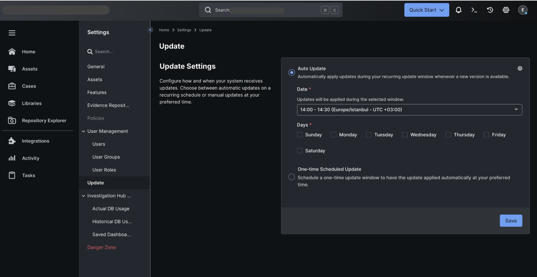 Section titled “Auto Update (Recurring Maintenance Window)”Auto Update allows XDR Forensics to automatically install new versions during a recurring update window that you configure.